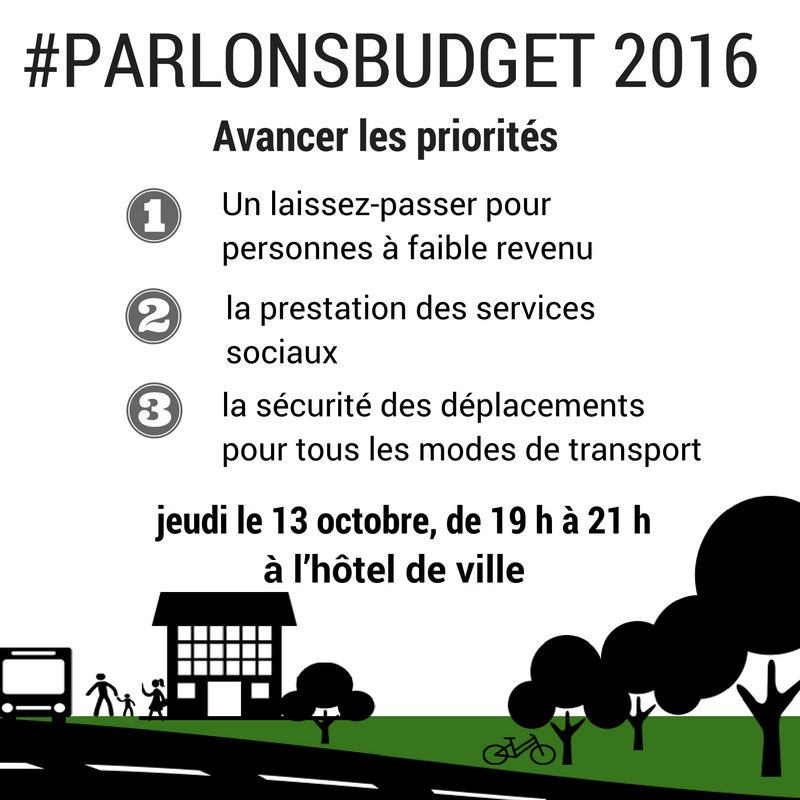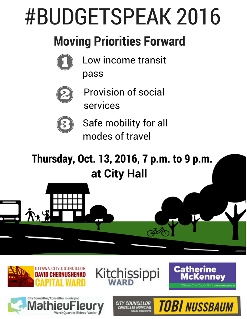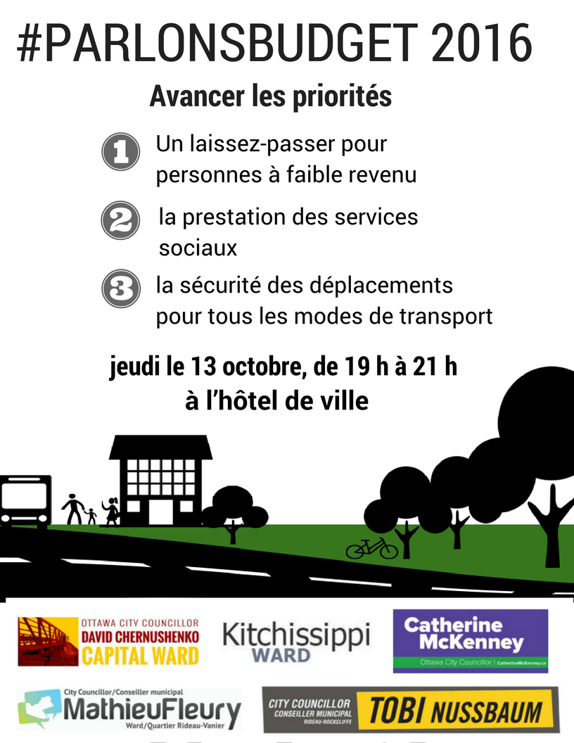 In preparation for both the 2015 and 2016 Budgets, City Councillors Chernushenko, Fleury, Leiper, McKenney and Nussbaum hosted a series of consultations with residents to get a better sense of their priorities – and the funding options – for the municipal budget. The hundreds of residents who participated in these sessions consistently ranked transit affordability, provision of social services and safe mobility for all modes of travel as their top priorities.
