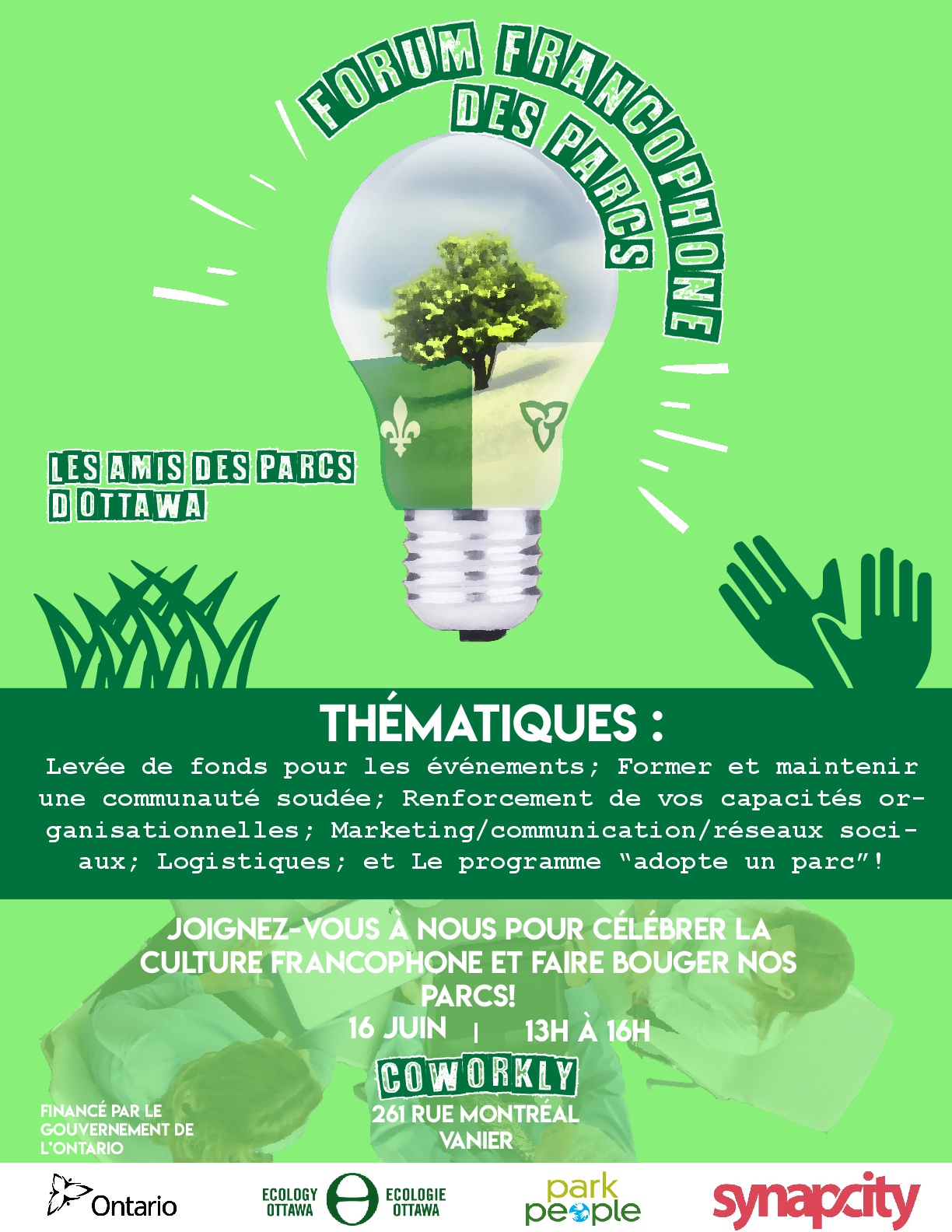 I’m reaching out to you and your community association to let you know of a program that Ecology Ottawa and Park People have embarked upon: Les Amis des Parcs. Funded by the Government of Ontario, Les Amis des Parcs will help francophone residents of Ottawa celebrate their culture in local green spaces and parks.