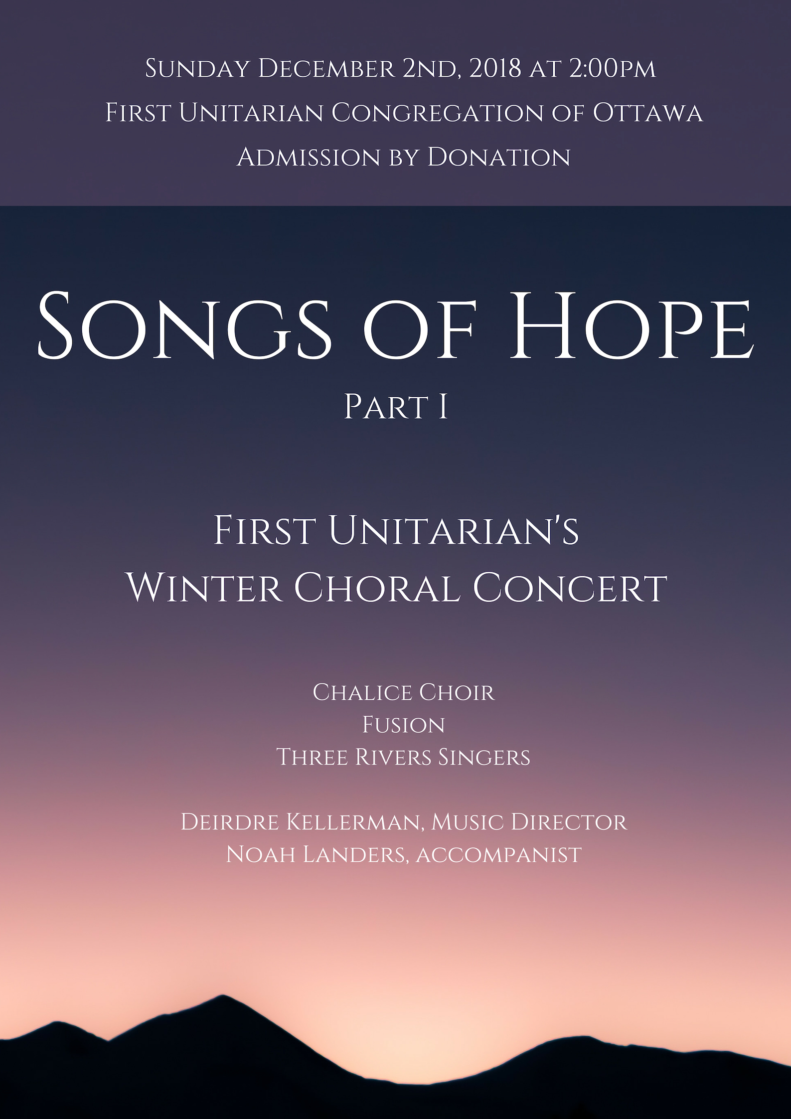 What gives you hope during these turbulent times? Come listen to the three choirs at First Unitarian Congregation of Ottawa as they explore the concept of hope through songs by Craig Hella Johnson, Eleanor Daley, Gordon Lightfoot, Sam Cooke and many more.
