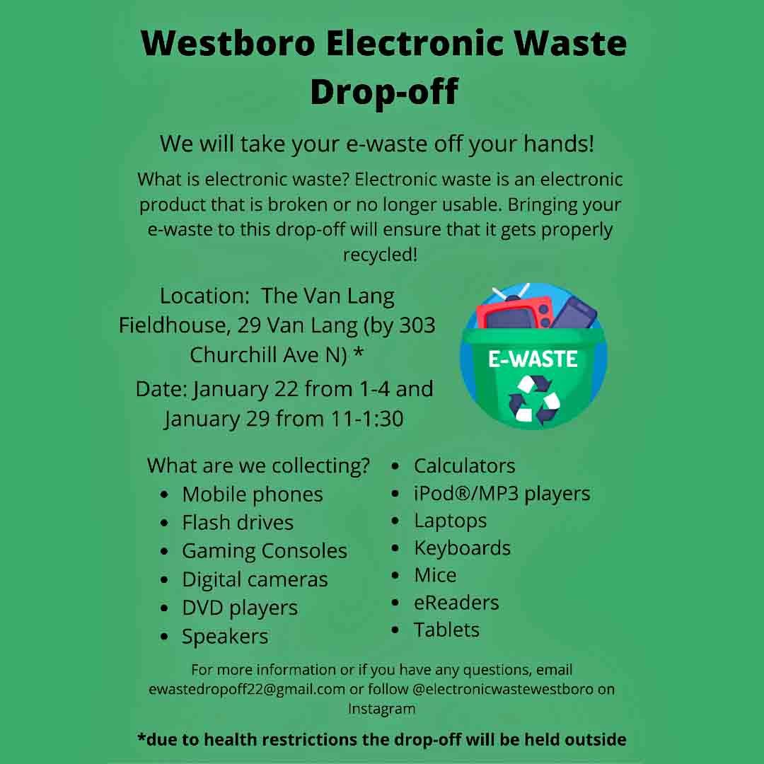 Thanks to Charlotte at Nepean High School who has organized a waste electronics drop-off as part of her environmental science class. The drop-offs will be at the Van Lang field house (29 Van Lang – next to 303 Churchill N.) on January 22 from 1-4 and on January 29 from 11-1:30. They’ll be collecting items such as flash drives, phones, MP3 players, laptops, mic, speakers, DVD players and more. Write to ewastedropoff22@gmail.com with your questions and follow @electronicwastewestboro on Instagram for updates. See the full poster here.