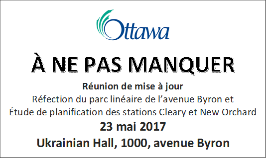 Nous aimerions vous inviter à une séance d’information publique sur le tronçon en tunnel de la ligne de train léger sur rail (TLR) entre les avenues Cleary et Woodroffe. Nous examinerons les façons de rectifier le tracé actuel sous le chemin Richmond, y compris les détails d’aménagement possibles sur l’avenue Byron et le parc linéaire Byron. Vos commentaires contribueront grandement à équilibrer l’importance accordée à ces trois secteurs. La réunion aura lieu le 14 septembre 2016 à l’église orthodoxe ukrainienne.